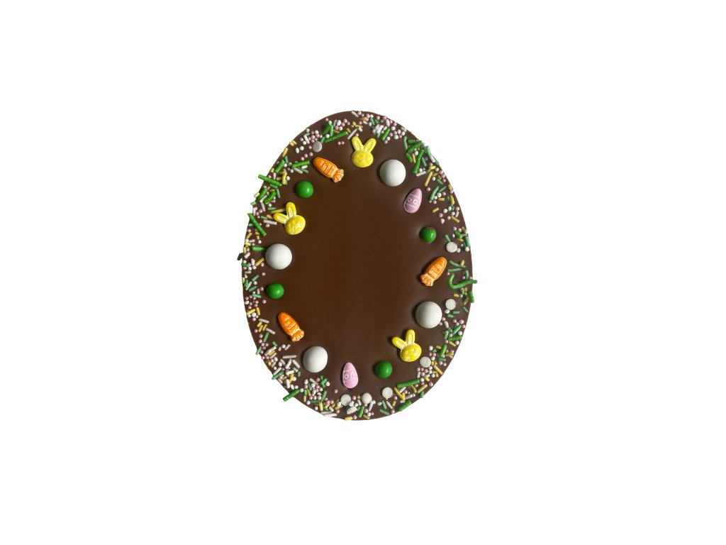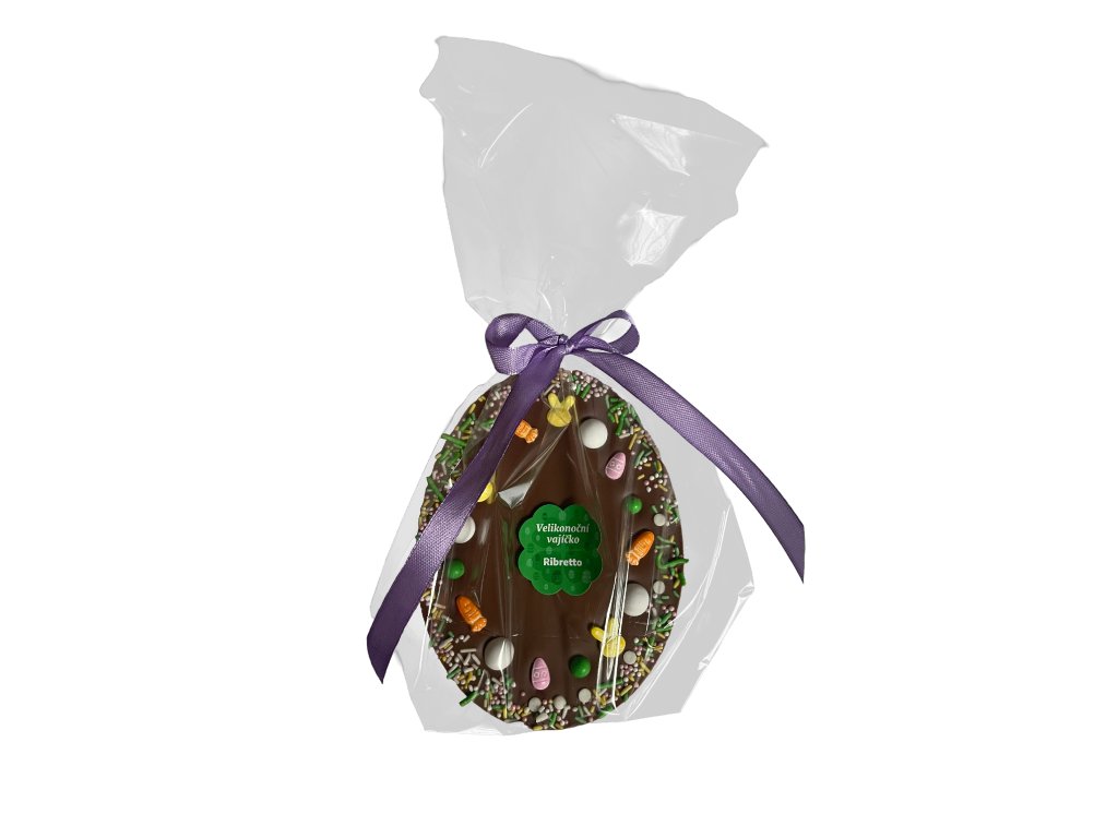 Mléčná čokoláda ve tvaru velikonočního vajíčka je zdobená barevným cukrovým a čokoládovým sypáním s veselými velikonočními motivy. Jemná, krémová chuť čokolády se snoubí s hravým křupnutím a vytváří sladkou radost pro malé i velké. Ideální jako milý dárek do koledy nebo jako stylová velikonoční dekorace, která se prostě sní.