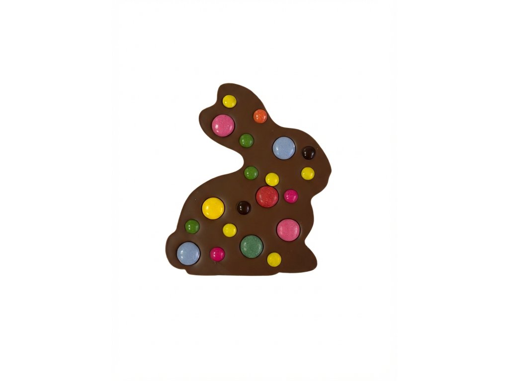 Mléčná čokoláda ve tvaru velikonočního zajíčka je bohatě zdobená mini lentilkami i většími lentilkami, které jí dodávají veselý vzhled i příjemné křupnutí. Jemná, krémová chuť čokolády se snoubí s hravou barevností a vytváří sladkost, která rozzáří každou velikonoční nadílku. Ideální jako dárek pro děti i pro ty, kdo si chtějí dopřát trochu barevné radosti.