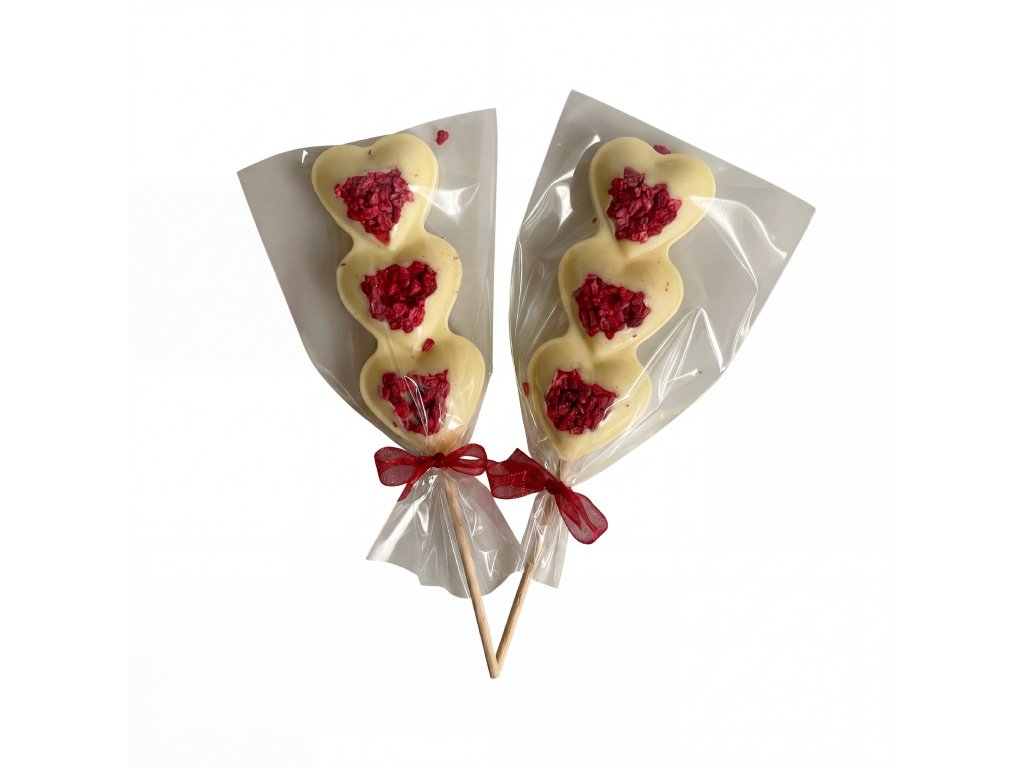 Valentýnské čokoládové lízátko ve tvaru srdíčka z jemné bílé čokolády s kousky lyofilizovaných malin okouzlí na první pohled svou elegantní barvou i harmonickou chutí. Sladká krémovost bílé čokolády se dokonale snoubí s lehce kyselkavými malinami a vytváří svěží, vyvážený chuťový zážitek. Ideální jako malá sladká pozornost z lásky, doplněk k dárku nebo roztomilé překvapení, které vykouzlí úsměv každému obdarovanému. Sladké srdce, které říká „mám tě rád“ za vás.