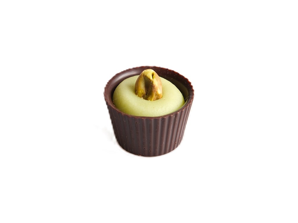 Pralinka ve tvaru kalíšku z hořké čokolády je plněná jemným pistáciovým marcipánem a ozdobená celou pistácií navrchu. Spojení výrazné čokolády a lahodných pistácií potěší všechny milovníky ořechových specialit.