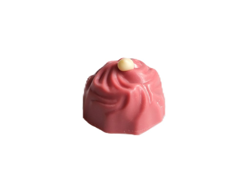 Pralinka ve tvaru kopečku z jemné ruby čokolády, která vyniká svou přirozeně ovocnou chutí a růžovou barvou. Uvnitř se snoubí vláčný marcipán s malinovým confitem z malinového pyré, které dodává pralince svěží ovocný akcent a krásnou rovnováhu sladkosti a kyselosti.