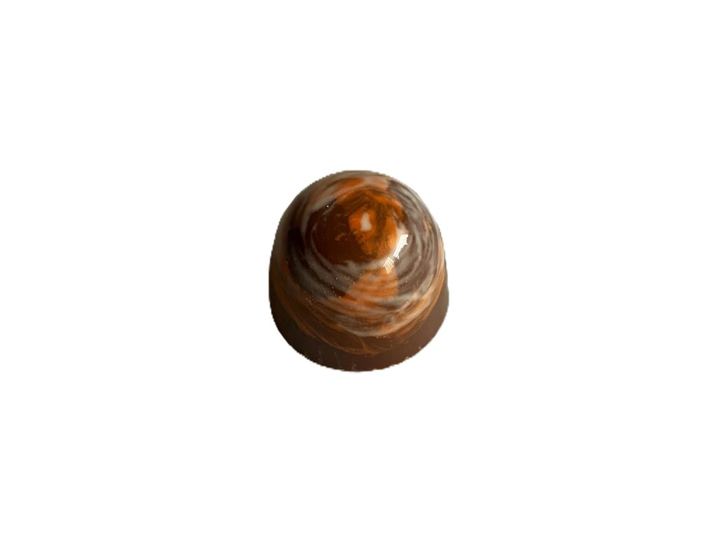 Pralinka ve tvaru kuželu z mléčné čokolády ukrývá svěží pomerančovou ganache z bílé čokolády a pomerančového pyré. Ganache je doplněná kousky křupavých pekanových ořechů. Eleganci a zajímavý vizuální efekt dodává pralince zdobení kakaovým máslem. Jemná sladkost, ovocná svěžest a oříšková noblesa v jediné pralince.