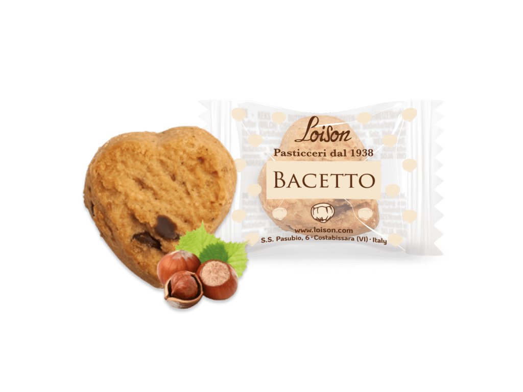 Bacetto: PŠENIČNÁ mouka, PGI „Piemonte“ LÍSKOVÉ OŘECHY 23 %, MÁSLO, cukr, šupinky hořké čokolády 9 % (kakaová hmota, cukr, emulgátor: SÓJOVÝ lecitin), med z divokých květů ze Sicílie, invertní cukr, přírodní bourbon vanilka z Madagaskaru* 0,2 %, přírodní aroma.