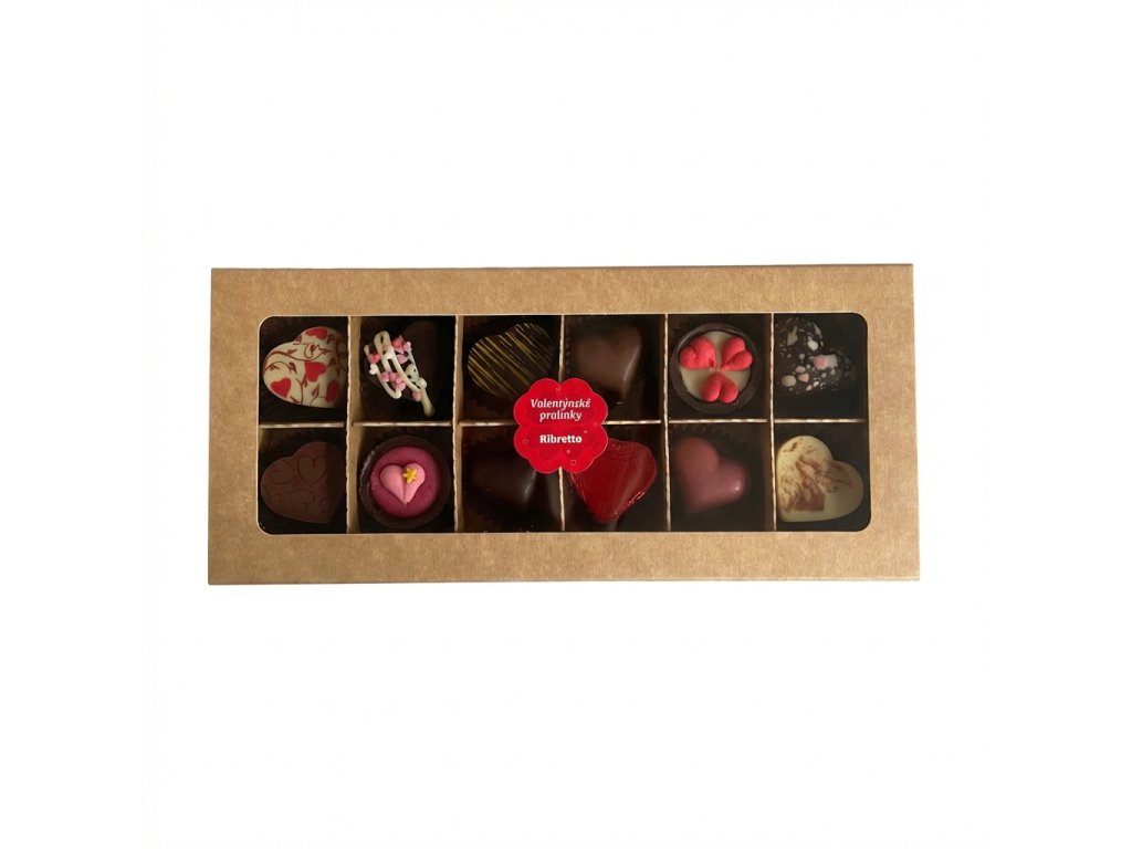 Dopřejte si kousek valentýnské atmosféry v podobě poctivé ručně vyráběné bonboniéry plné valentýnských chutí a barev. Uvnitř se ukrývá 12 originálních pralinek s valentýnskými náplněmi – např. rum, marcipán, malina či pistácie a další oblíbené kombinace, které provoní Váš valentýnský večer. Každá pralinka je ozdobena s péčí a fantazií – najdete tu valentýnské potisky, drobné cukrové ozdoby ve tvaru srdíček, i pralinky zabalené do červeného staniolu, které dodávají celé krabičce zamilovaný vzhled. Celé kouzlo doplňuje přírodní kraftová krabička, která působí elegantně a zároveň útulně – ideální jako malý dárek pro radost nebo stylová pozornost ke sv. Valentýnu.