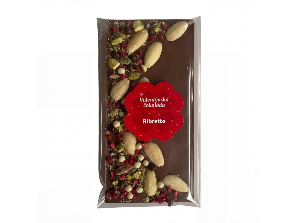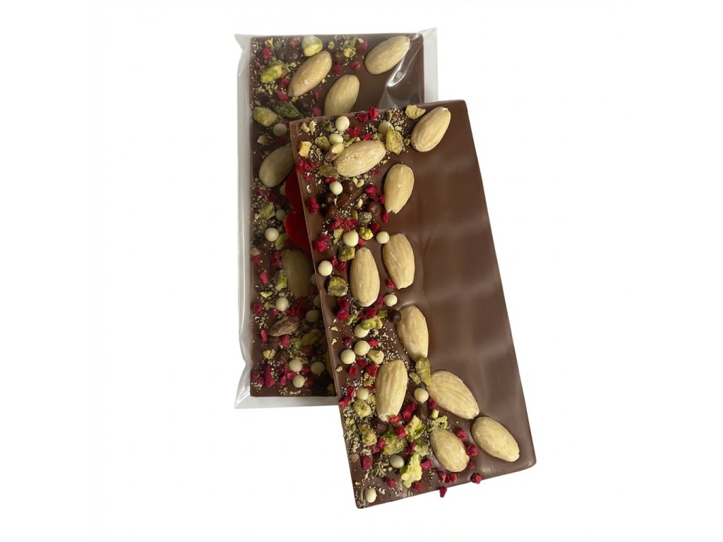 Nechte se okouzlit jemnou mléčnou čokoládou, která se rozplývá na jazyku a je bohatě zdobená křupavými mandlemi, pistáciemi, lyofilizovanými malinami a hravými čokoládovými kuličkami. Každé sousto nabízí dokonalou harmonii chutí i textur – sladkou, jemně kyselkavou i příjemně křupavou. Tato valentýnská čokoláda je ideální jako sladké vyznání lásky, malé potěšení pro sebe nebo stylový dárek, který řekne „mám tě rád“ i beze slov. Perfektní ke společným romantickým chvílím, šálku kávy či horké čokolády.