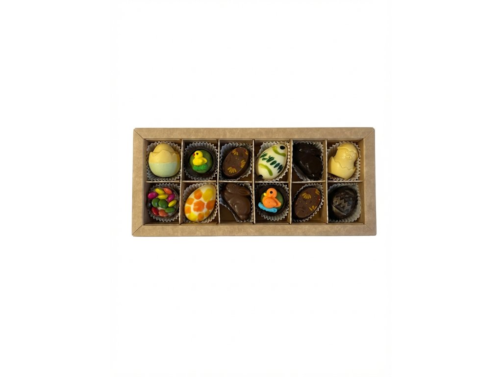 Dopřejte si kousek velikonoční atmosféry v podobě poctivé ručně vyráběné bonboniéry plné svátečních chutí a barev. Uvnitř se ukrývá 12 originálních pralinek s různými náplněmi – např. malina, karamel nebo marcipán. Každá pralinka je ozdobena s péčí a fantazií – najdete tu velikonoční potisky, drobné cukrové ozdoby ve tvaru velikonočních kuřátek a slepiček, ručně malovaná vajíčka nebo duté mini kachničky, které dodávají celé krabičce barevný sváteční vzhled. Celé kouzlo doplňuje přírodní kraftová krabička, která působí elegantně a zároveň útulně – ideální jako malý dárek pro radost nebo stylová pozornost pro koledníky.