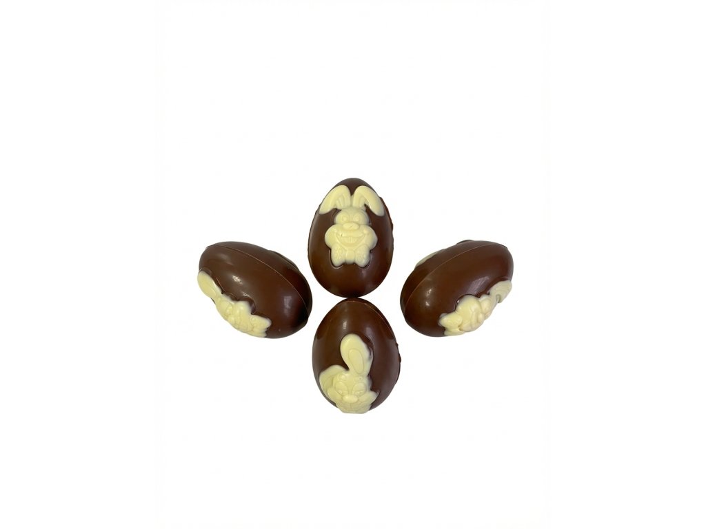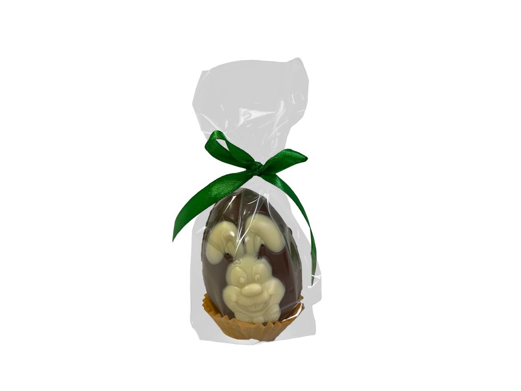 Duté velikonoční vajíčko z jemné mléčné čokolády zdobí na povrchu roztomilý zajíček z bílé čokolády. Kontrast krémové mléčné čokolády a světlého dekoru vytváří elegantní a zároveň hravý sváteční vzhled. Lehké, křehké vajíčko je ideální jako velikonoční dárek, ozdoba košíku nebo stylová sladká dekorace na sváteční stůl. Spojení dvou druhů čokolády potěší nejen vzhledem, ale i harmonickou chutí, která se příjemně rozplývá na jazyku. Každý kus je pečlivě vyrobený originál, který přinese kousek jarní radosti do každého domova.